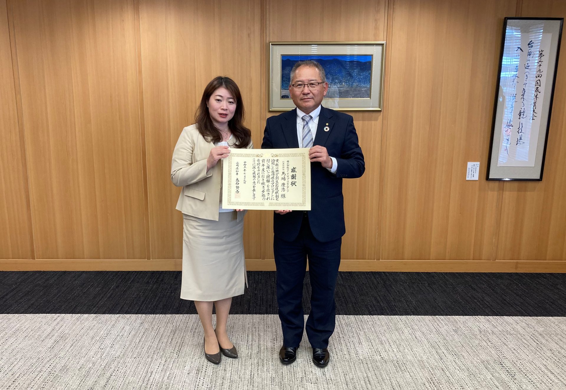 長崎県庁「企業版ふるさと納税」の目録贈呈及び感謝状授与式 2023年7月19日 by アイ・デベロップ・コンサルタンツ管理者 令和5年7月19日(水)に長崎県庁において、長崎県知事様から『企業版ふるさと納税寄附企業』として感謝状を頂きました。感謝状贈呈式は長崎県では初の女性副知事に就任されました馬場副知事様から感謝状の贈呈が行われ、歓談会では『企業版ふるさと納税』の活用について説明を受けた後に記念撮影が行われました。今後の長崎がより良くなるために活用して頂くことを祈念致します。