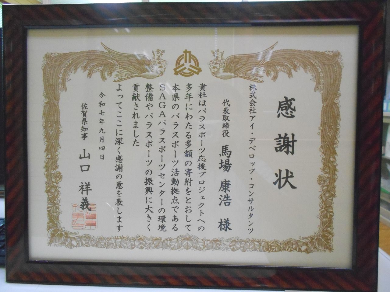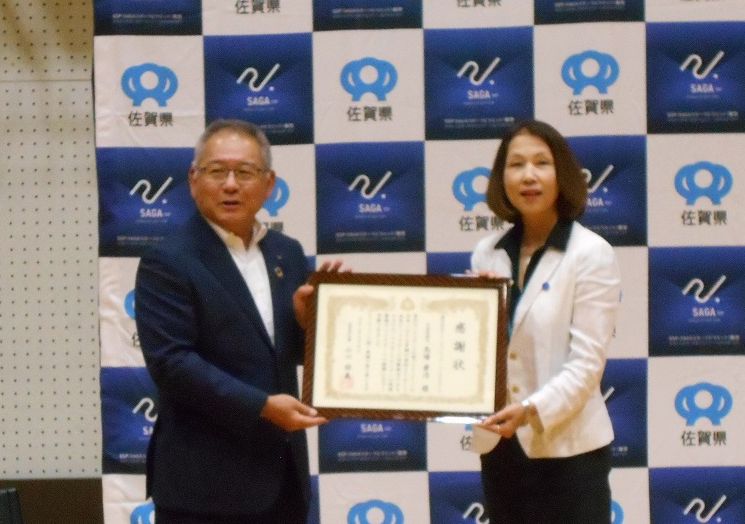 令和7年9月4日(木)SAGAパラスポーツセンターにおいて、佐賀県知事様から「企業版ふるさと納税」を活用した「パラスポーツ応援プロジェクト」に対して寄付を行ったことについて、感謝状を頂きました。